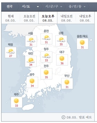 이날 낮 최고 기온은 29∼37도로 전날과 비슷할 것으로 보인다. 특히 포항의 낮 최고 기온은 37도, 대구·구미는 36도로 불볕 더위가 이어질 전망이다.