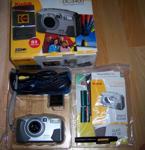 박스 풀셋 입니다. 메모리 128 메가 구요!! 최고화질로 211 장 찍을수 있습니다. 코닥 정품 청소도구 있구요!! 충전지 4알 있구요!! 제품에 아무 이상 없습니다. 코닥 DC3400 이구요!! 화소는 230만 화소 입니다. 이제품 얼마에 팔면 될까요? 얼마정도 받을수 있을까요?