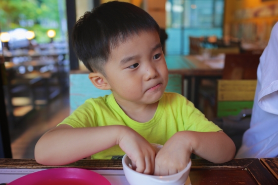 아들은 파마산 치즈를 큰 덩어리를 갈아서 음식 나오기전 미리 받아, 두손으로 열심히 치즈를 먹습니다.