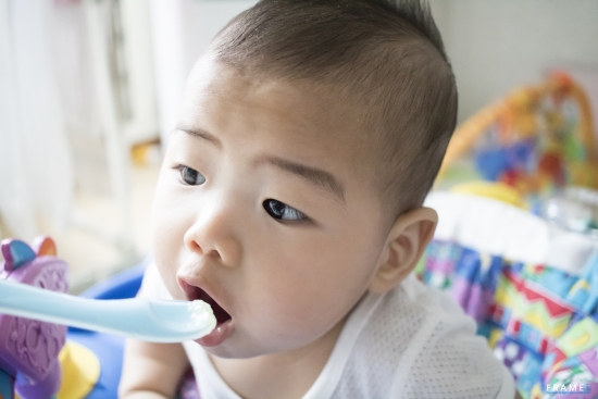 사진은 한손으로는 사과퓨레를 직접 떠먹이며 다른손으로 찰칵 담아봤습니다.