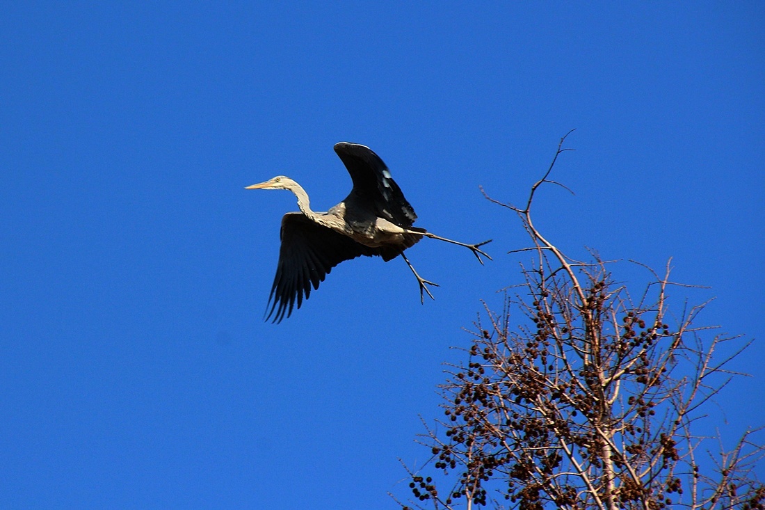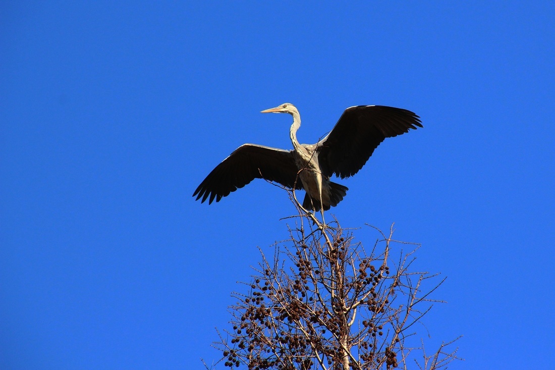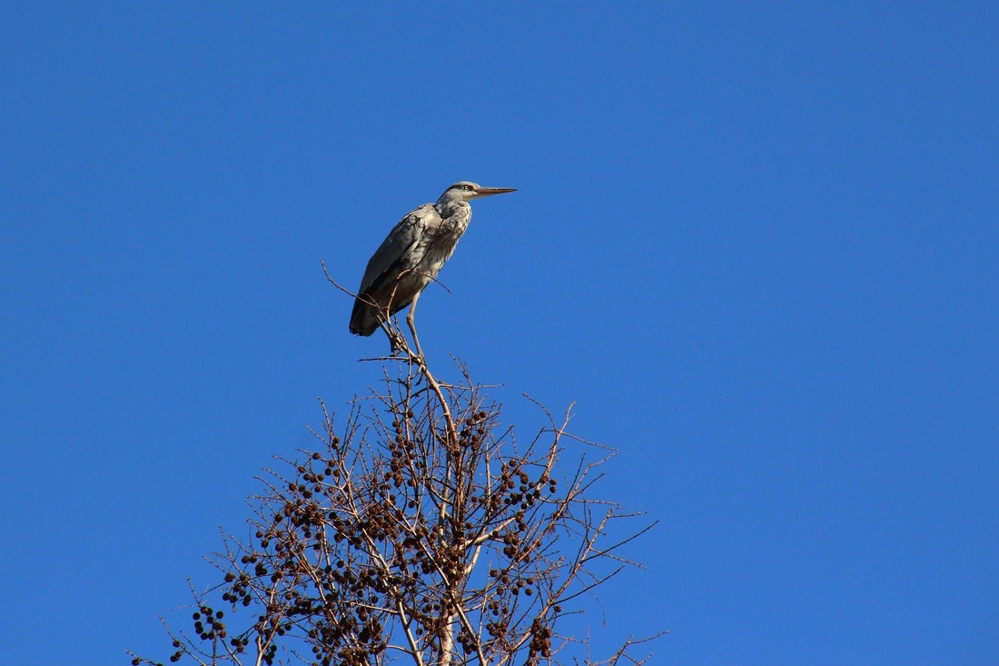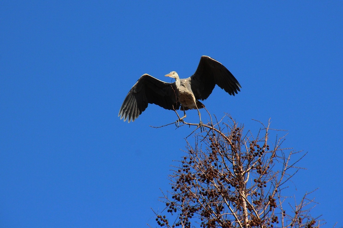 파란 하늘을 배경으로..  높은 나무 위를 오르 내리는 외로운 왜가리 한마리와.. 직박구리