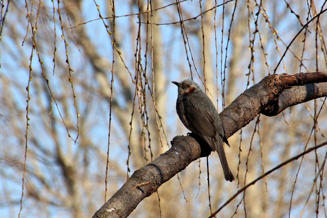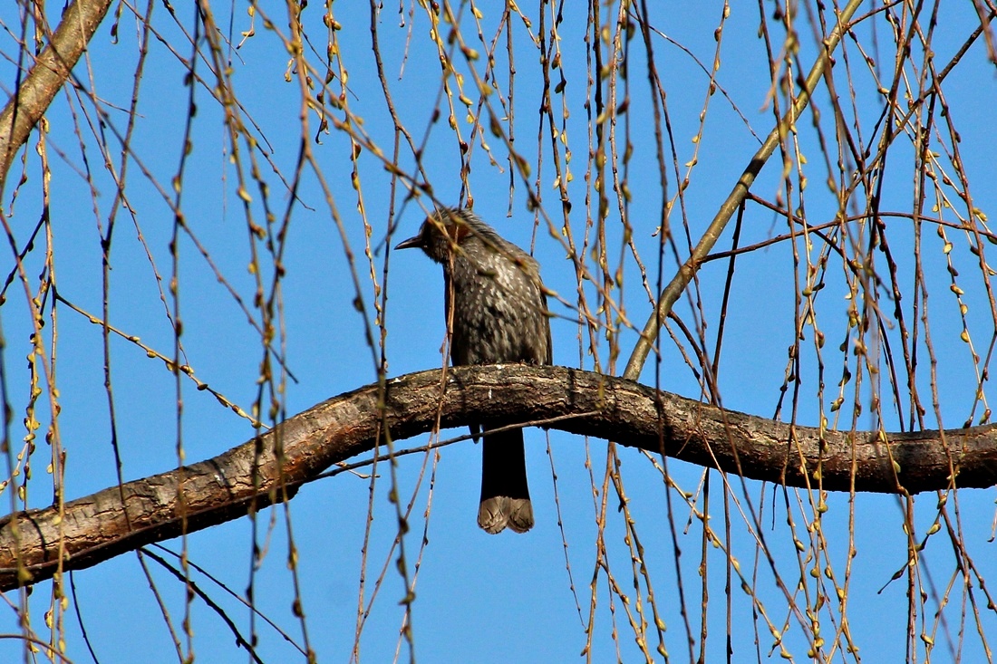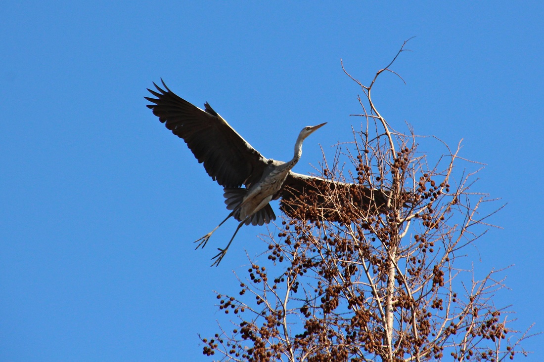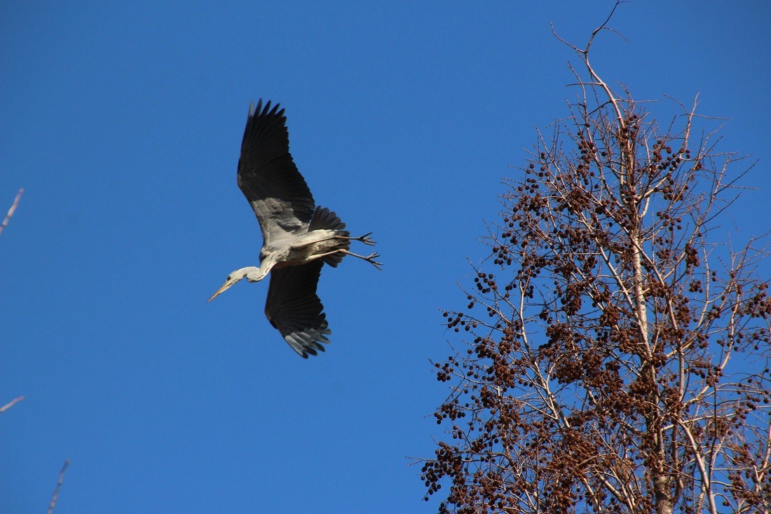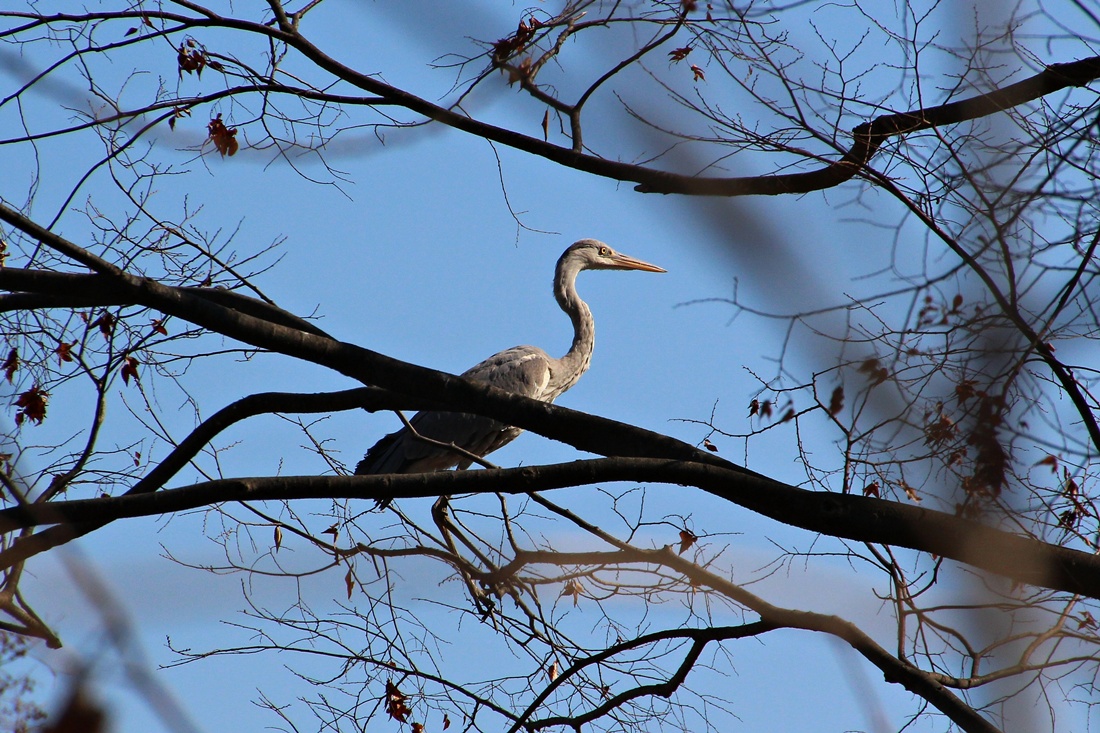 파란 하늘을 배경으로..  높은 나무 위를 오르 내리는 외로운 왜가리 한마리와.. 직박구리