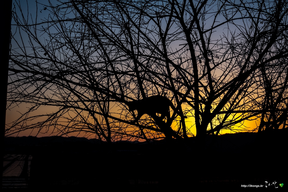 해질 무렵까지 변변한 사진 한 정 건지지 못했습니다. 어쩌지? 오늘도 옛날 사진 올려야되나? 살짝 불안해질 즈음 우리집 냥이가 나무위로 폴짝 올라섭니다. 지는 해는 서산 끝자락에 걸려있고 미처 노출을 맞추지 못한 초보 찍사는 실루엣을 찍고 말았습니다. 고맙다 후지.