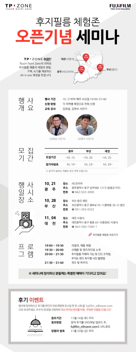후지필름 유저 중 지방에 계신 분들 좋으시겠네요! 매번 지방에 계신 분들의 아쉬움이 많았는데 좋은 세미나가 이제 지방에서도!