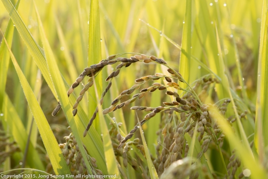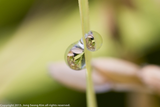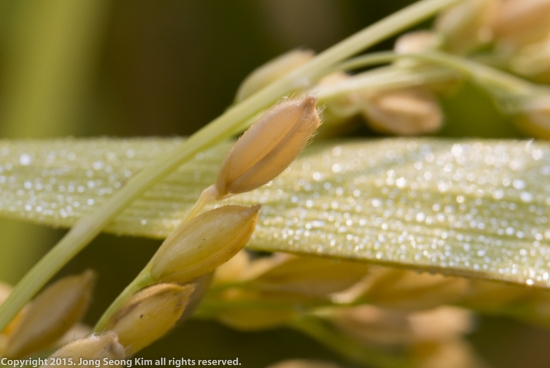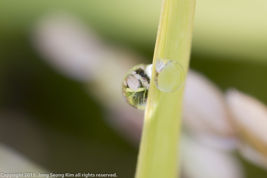 볏잎에 맺힌 이슬을 통해 벼이삭을 찍어 보았습니다.