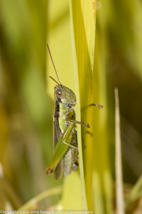 전형적인 가을모습인 벼에 앉은 벼메뚜기입니다.