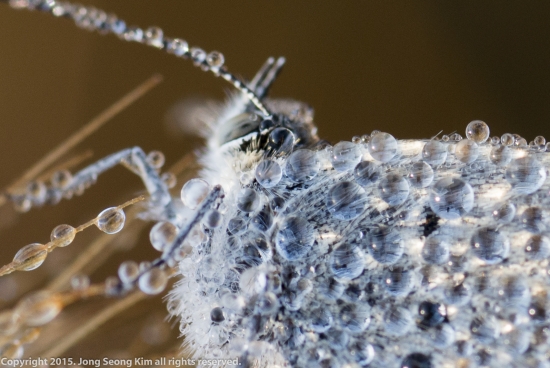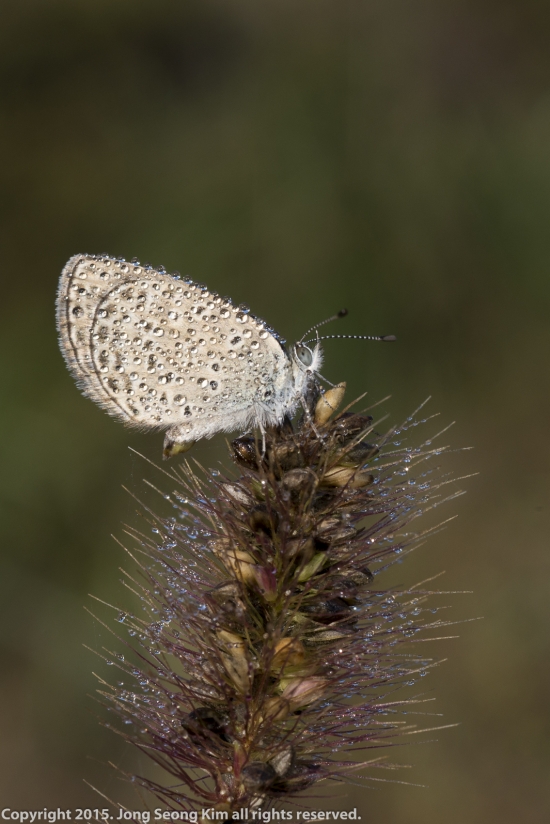 며칠간 별로 예쁘지 않은 벌레들만 올려서 ...이미지 개선을 위해 오늘은 조금 예쁜 것을 올립니다.지난 토요일 아침 변함없는 저의 서식지 갑천에서 만난 이슬 머금은 작은 부전나비 입니다.