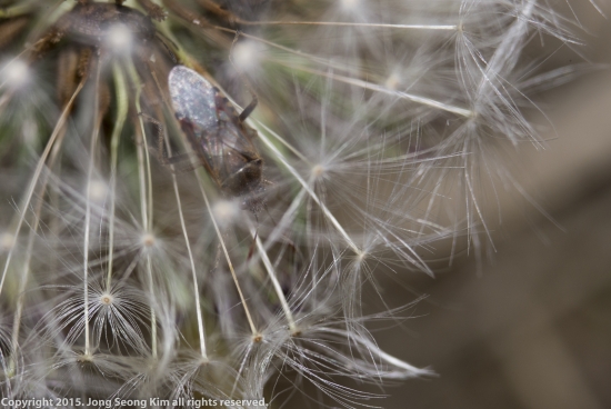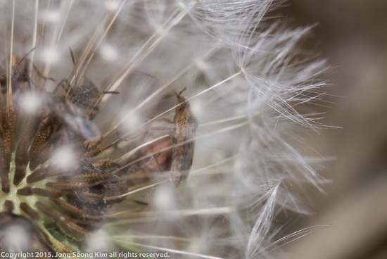 민들레 홀씨 속에 숨어있는 노린재로 보이는 곤충들입니다.