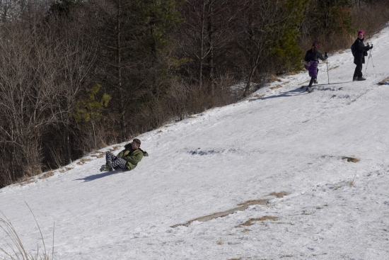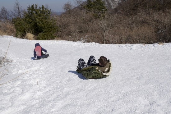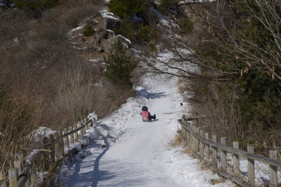 등산로가 임도처럼 넓고 경사또한 완만해서 눈썰매 타기 좋습니다.