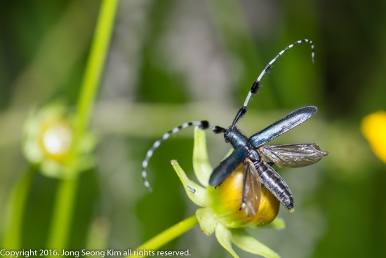 남색초원하늘소가 날기 직전에 날개를 편 모습입니다.