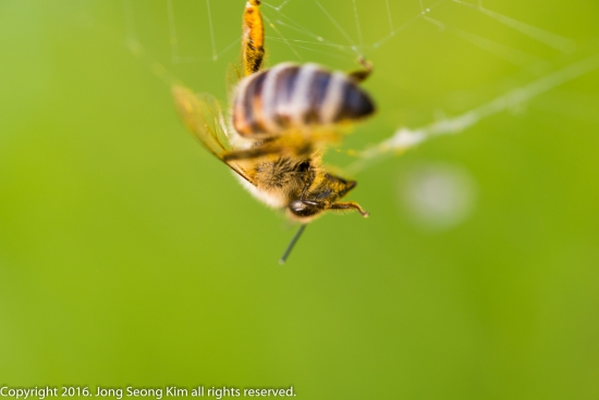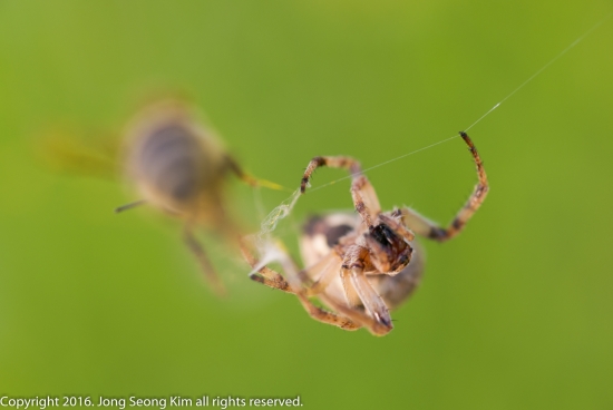 꿀벌 한마리가 날아가다 거미줄에 걸려서 바둥거리고 있을때 거미가 다가옵니다.