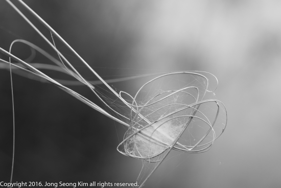 거미가 집을 짓느라 마른 풀가지를 이리저리 구부린 모습입니다.