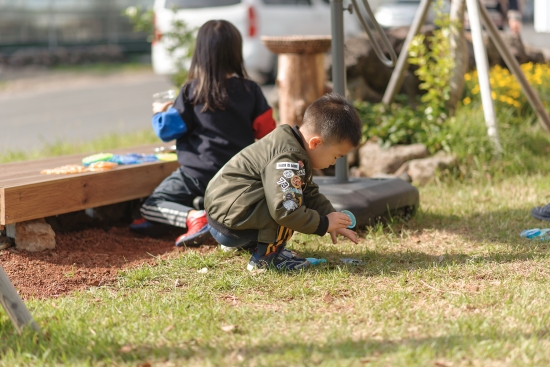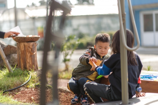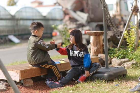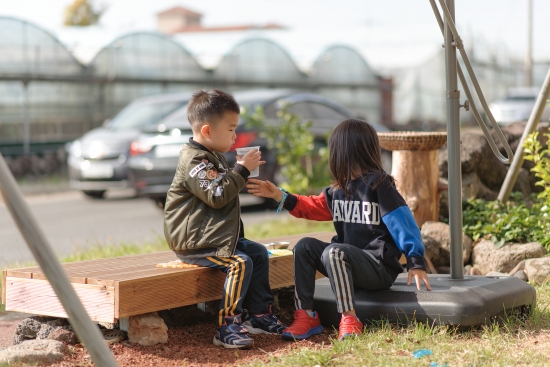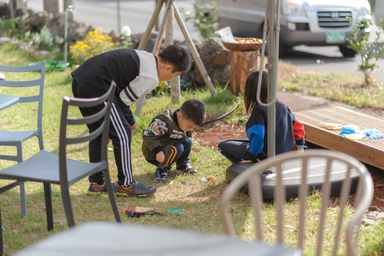 카페 마당에서 아이들 딱지치기