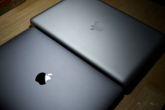 맥북의 상징과 같던 불켜지는 사과마크대신 반사되는 검은 사과....