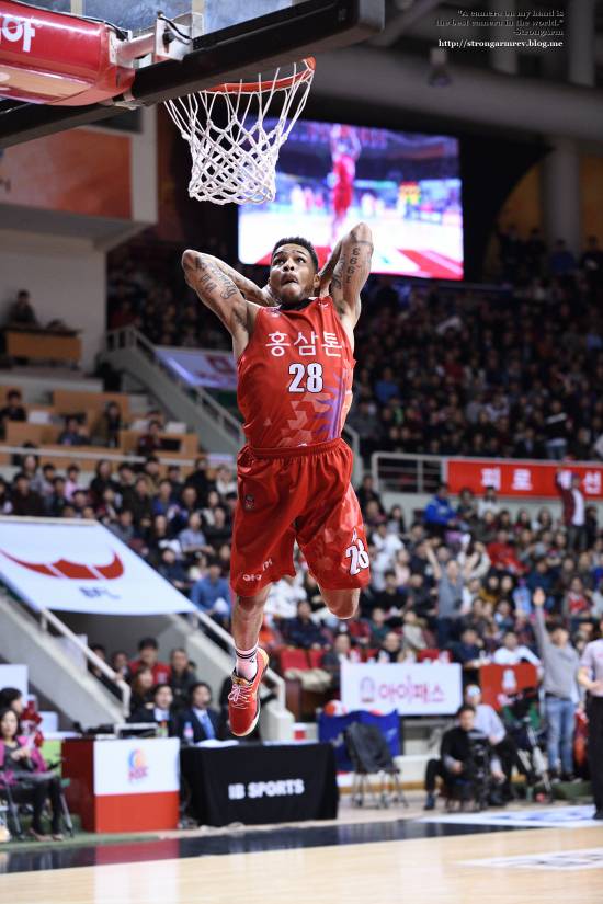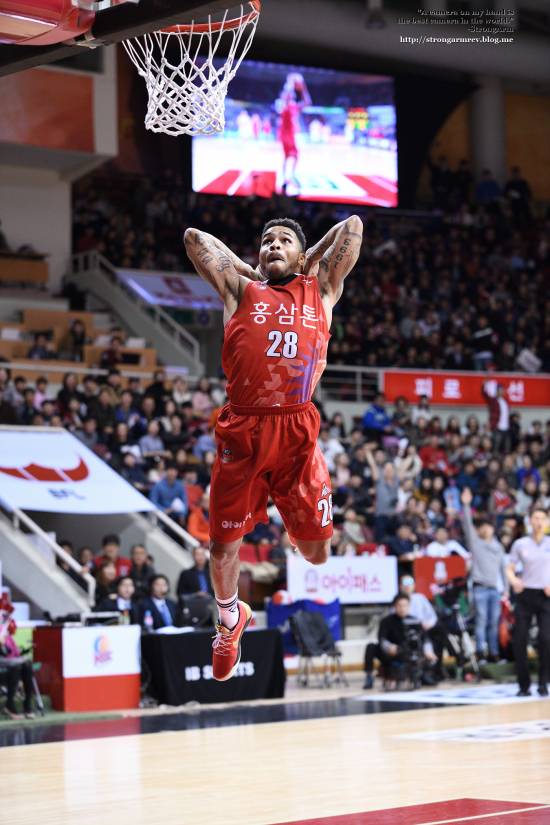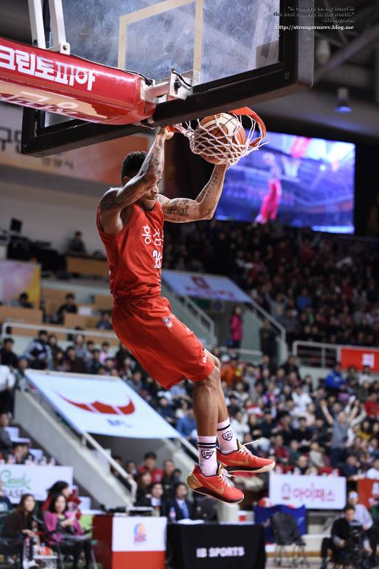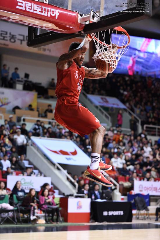 탐론 SP AF 70-200mm F2.8 Di VC USD G2로 담은 키퍼 사익스 선수의 속공 상황에서 투핸드 덩크 장면입니다.