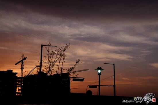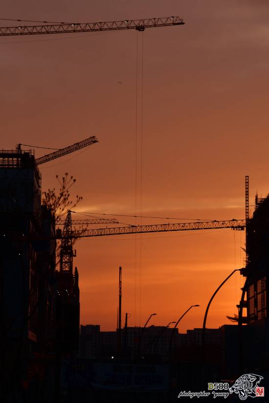 붉은 노을 속에서 건설현장