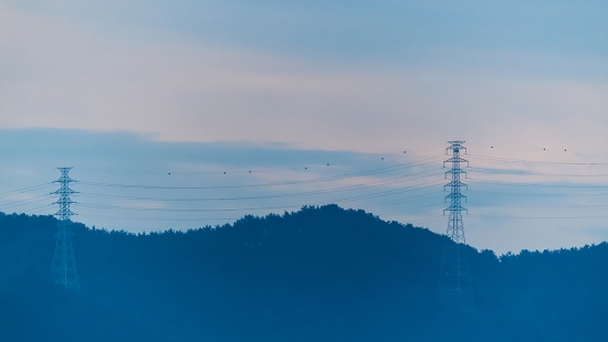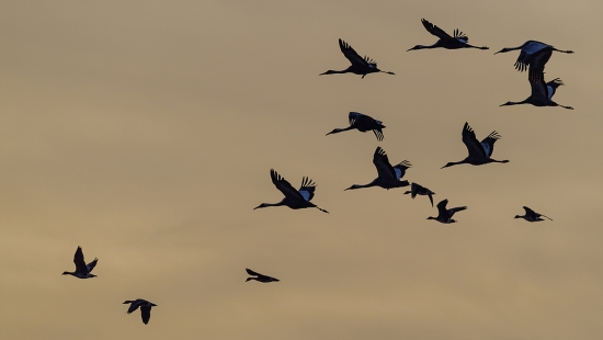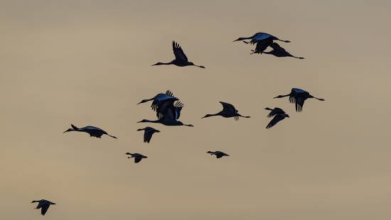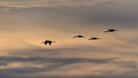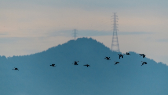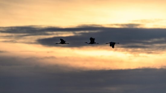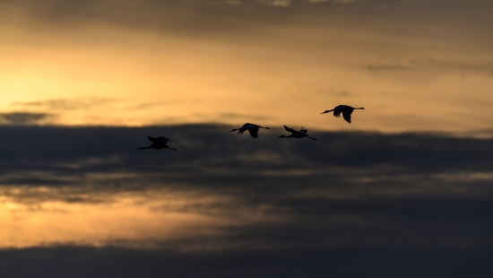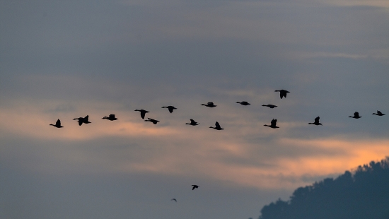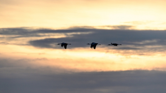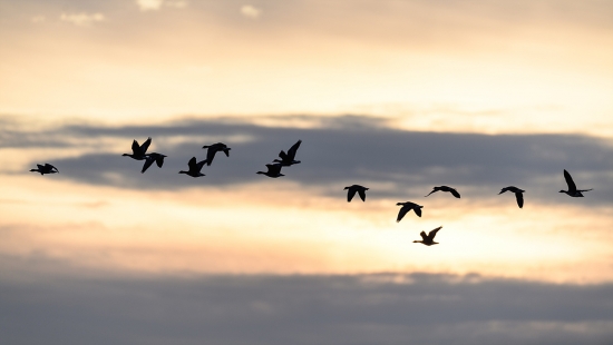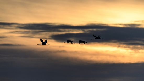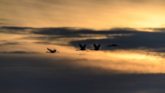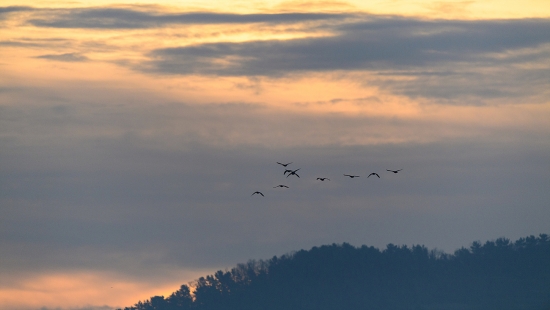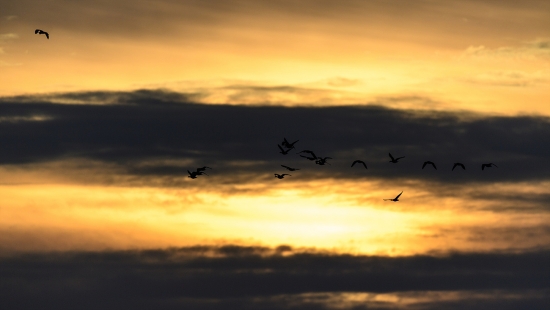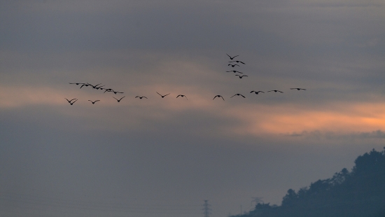 일출을 뒤로한 새들의 비행