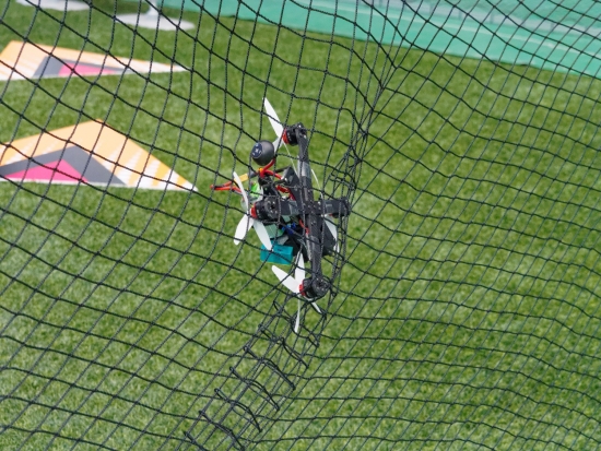 전문 드론 레이싱 선수들이 시범을 보이고 있습니다.