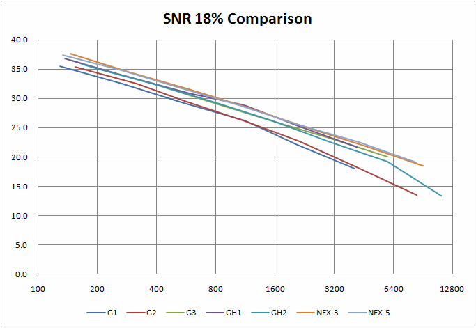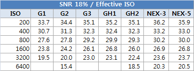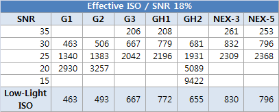 - G3, GH1, GH2는 NEX-5 대비 센서 크기의 차이보다 적은 노이즈 수준의 차이를 보여줍니다.