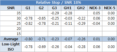 이를 통해서 NEX-5 대비 노이즈 수준이 몇 스탑 가량 우위 또는 열세인지 확인할 수 있게 됩니다.