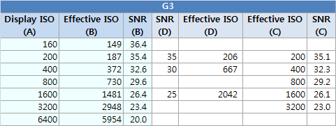 반면 G3, GH2는 대략 1/4 스탑 정도만 노이즈가 열세로 나타납니다. (SNR 30 구간에서는 GH2 > G3,