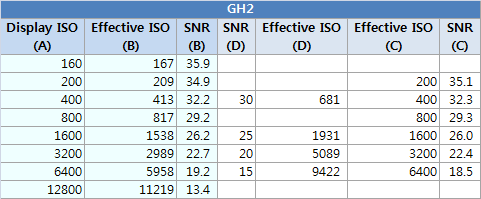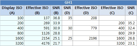- GH1은 저감도에서는 NEX-5 대비 크게 떨어지지만, 중간 감도에서는 NEX-5와 거의 동등하며,
