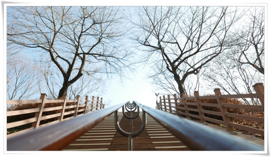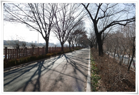계단을 올라오니 산책로가 펼쳐지고 추운 날씨인데도 산책하시는 분들이 많이 보였습니다.  길 위로 쏟아지는 햇살과 나뭇가지 만든  아른거리는 그늘이 보기 좋았습니다.  사진을 찍는데 셔터속도가 모자란다는 경고가