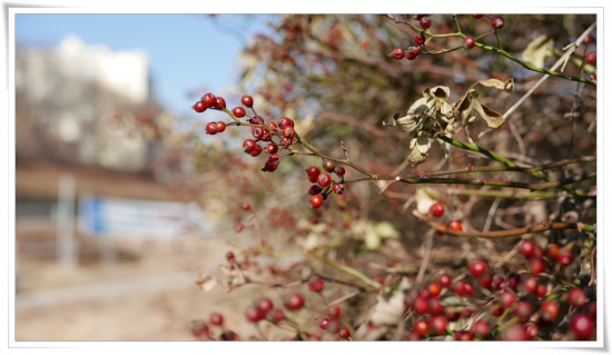 억새밭이 있는 곳까지 산책로가 나있었습니다.  천천히 걷다보니  열매들이 떨어지지 않고 아직 달려있었습니다.  근접 접사로 촬영해 보았습니다.  오른쪽 얽혀진 잎사귀가 보이지 않았다면 어떨까 생각해 봅니다.