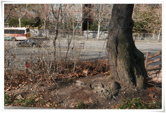 나무 밑둥아래로 햇살이 비치는데  땅에 푸른 풀들도 보이고 인상적이었습니다.  나무 전체를 활영하니 앙상한 가지들이 정신없이 얽혀있어서 시선이 집중되는 곳이 없었습니다.  그래서 밑둥만 촬영해 보았습니다.