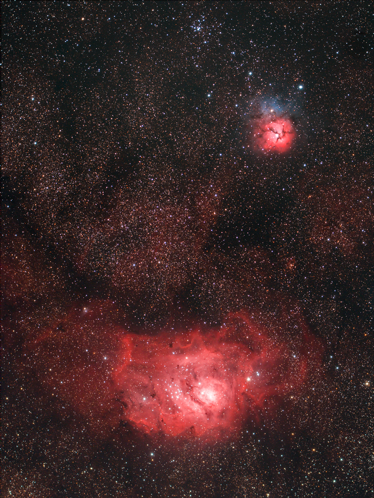 은하수의 중심부쪽에 떡하니 자리잡은 석호성운(M8)과 삼렬성운(M20)입니다.