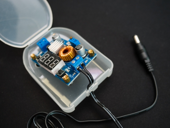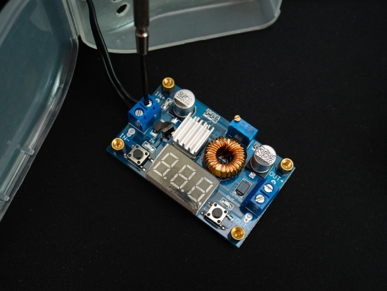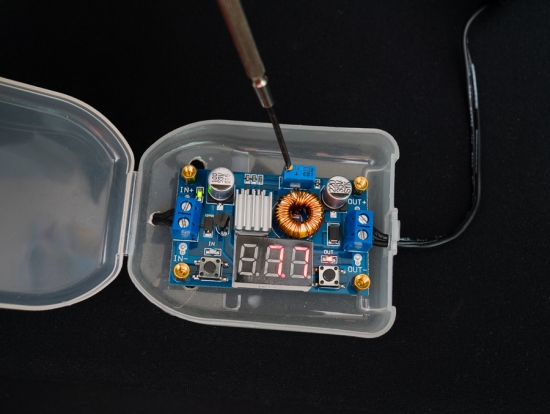 ▲ 12V 배터리에 연결하고, 드라이버로 위쪽의 나사를 돌려 전압을 조절한다.