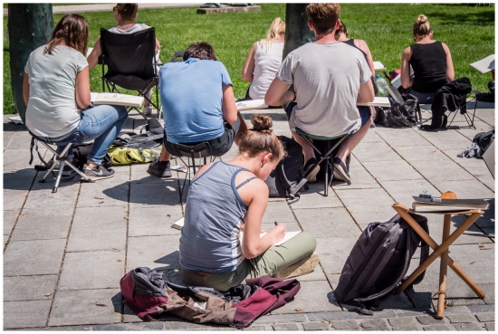 대학 건물 앞에서 학생들로 보이는 사람들이 따스한 햇살아래 그림을 그리고있습니다.