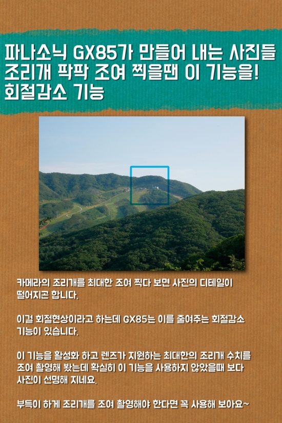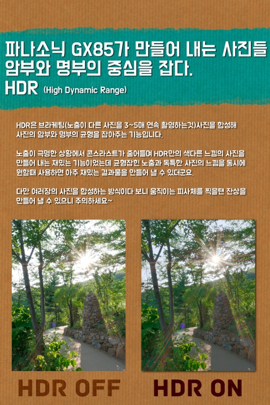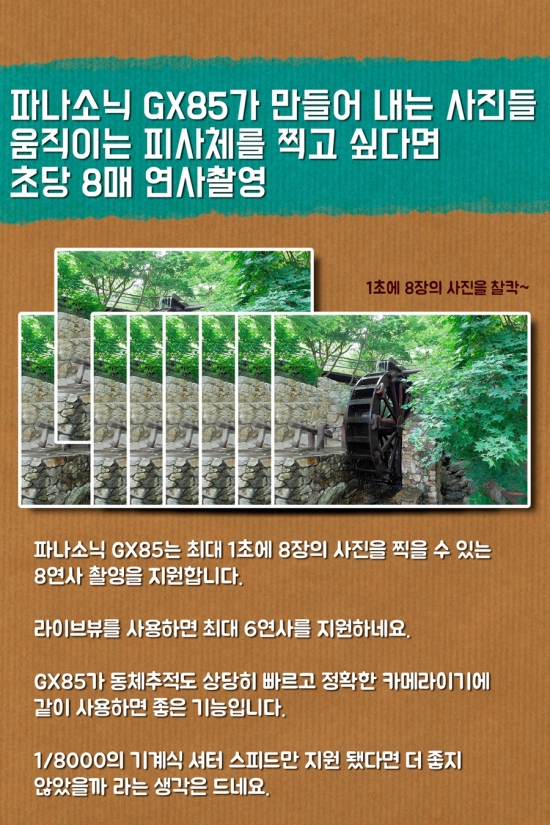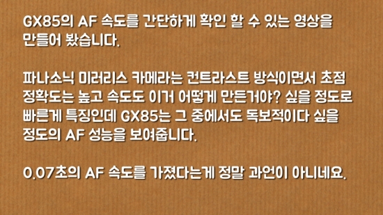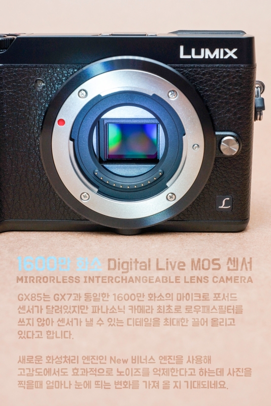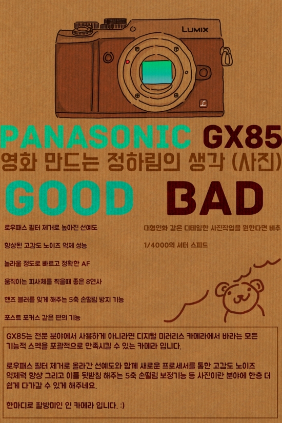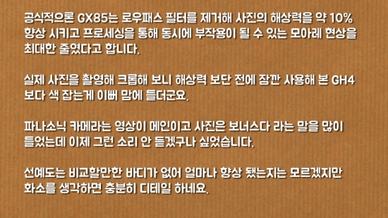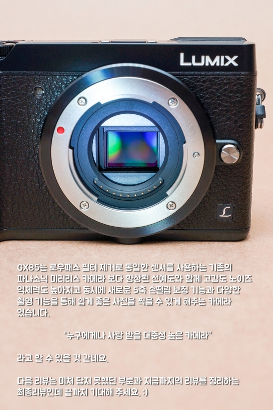 l 안녕하세요, 영화 만드는 정하림입니다. 파나소닉 GX85 미러리스 카메라는 로우패스 필터를 제거해 선예도는 높히면서 새로운 뉴 비너스 이미지 프로세서를 사용해 고감도 성능을 향상 시킨 카메라 라고 알려져 있습니다. 거기다 파나소닉 카메라 최초로 카메라 안에 5축 손떨림 방지 기능이 들어가 있어 더욱 기대가 큰데 과연 이 카메라로 찍을 수 있는 사진은 어떨까요? GX85는 로우패스 필터 제거로 동일한 센서를 사용하는 기존의 파나소닉 미러리스 카메라 보다 향상된 선예도와 함께 고감도 노이즈 억제력도 높아지고 동시에 새로운 5축 손떨림 보정 기능과 다양한 촬영 기능을 통해 쉽게 좋은 사진을 찍을 수 있게 해주는 카메라 였습니다. “누구에게나 사랑 받을 대중성 높은 카메라” 라고 할 수 있을 것 같네요. 다음 리뷰는 미처 담지 못했던 부분과 지금까지의 리뷰를 정리하는 최종리뷰인데 끝까지 기대해 주세요. :)