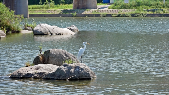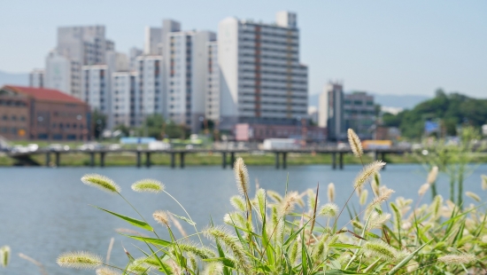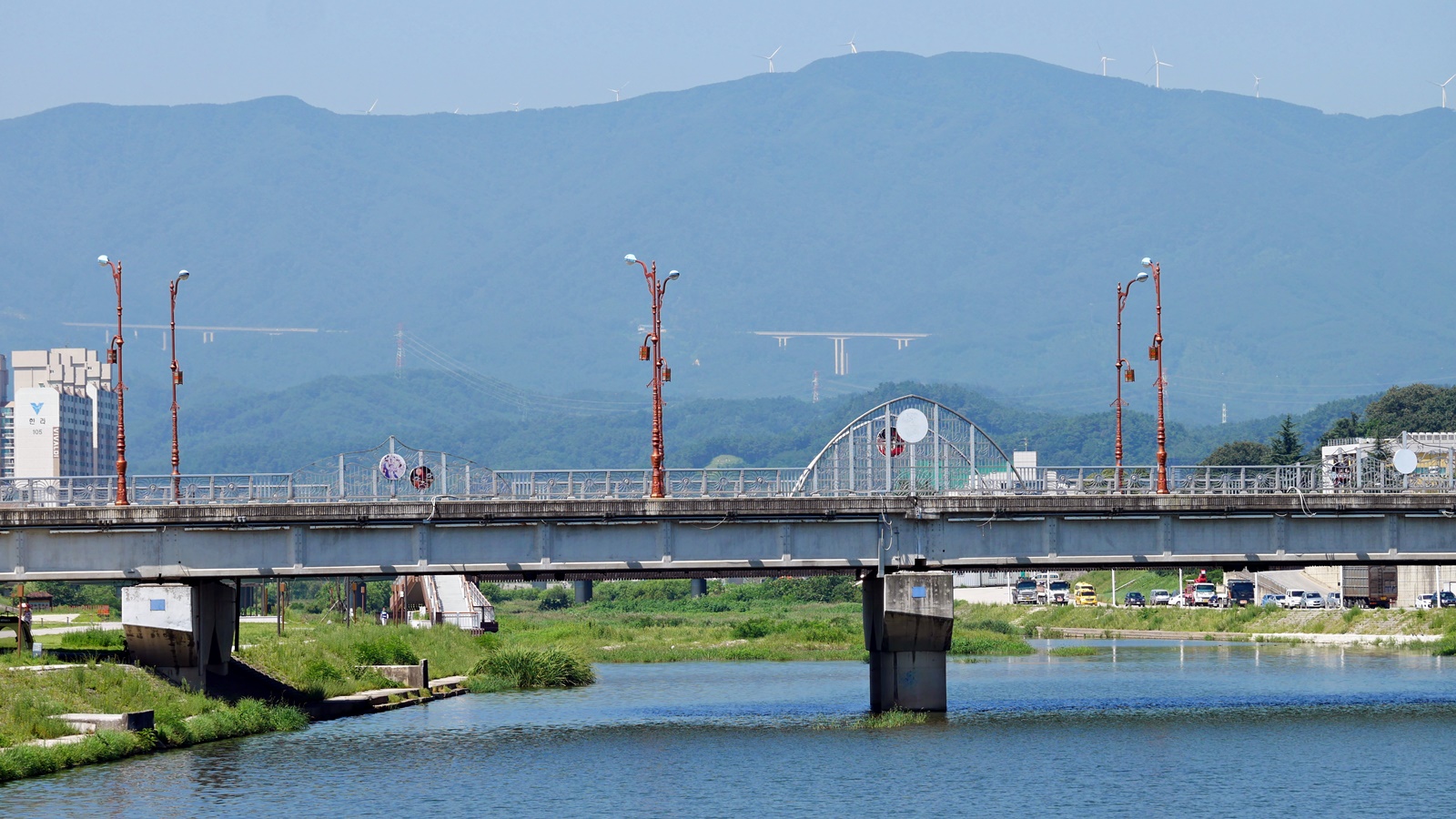 다리뒤로 대관령이 보이는군요...오늘은 날씨가 아주 깨끗한 편이 아니라 청명하게 안보이네요.....