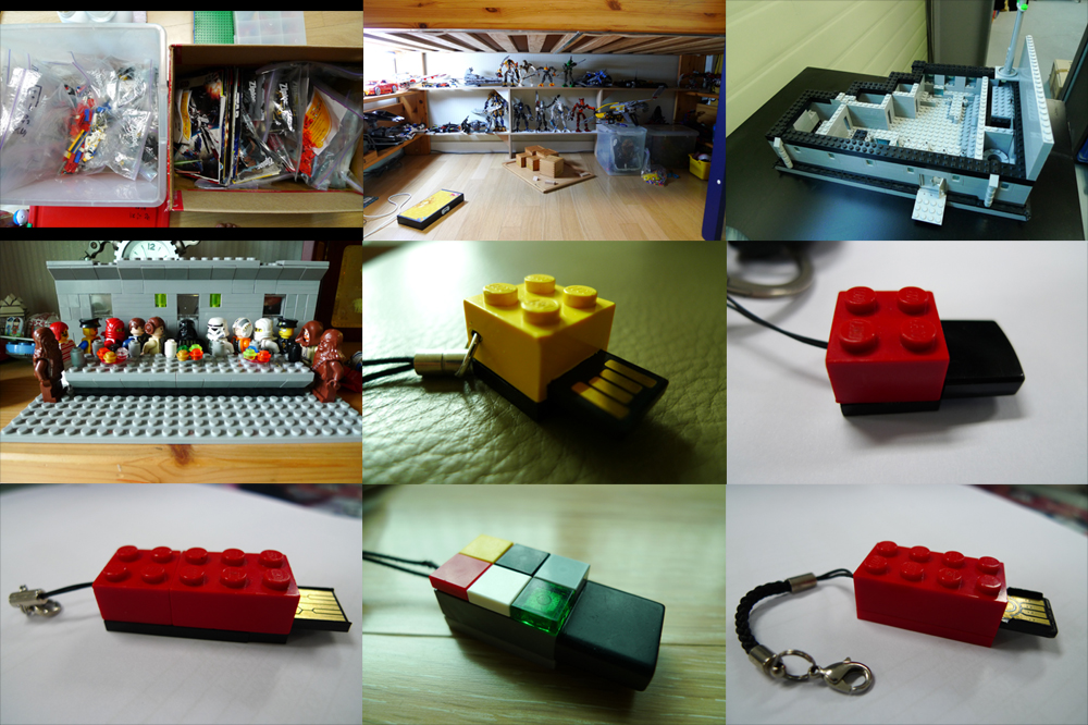 그리고 현재는 USB 메모리를 브릭 안에 넣는 걸 하고 있습니다. 지금까지 다섯개를 만들었는데, 할 때마다 개선이 되고, 메모리마다 모양이 틀려서 만드는 재미가 있습니다. 사진에 보시면 첫번째 노란 것은 줄을 미리 달지 않아서 나중에 뚫었구요... 나머지는 미리 안쪽이 구멍을 뚫어서 줄을 넣었습니다. 뚜껑이 원래 있는 것은 활용을 했구요...