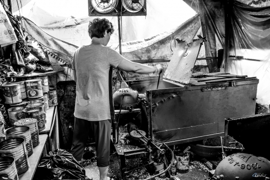 강냉이 뻥튀기 기계 뱃속에 넣고
