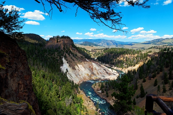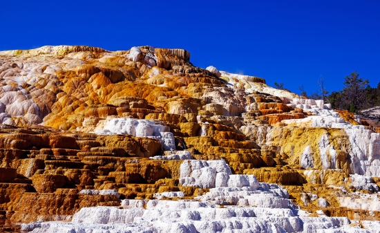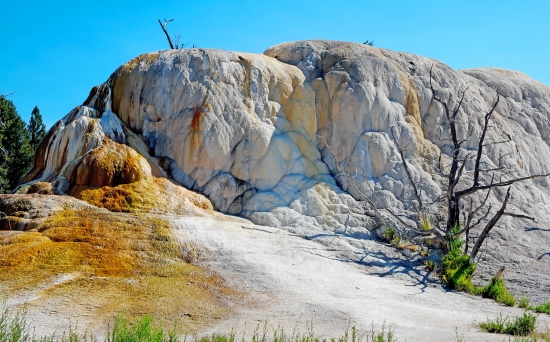 공원 북쪽 에 맘모스 핫 스프링 이 라 는 지역 입니다. 수천년동안 간헐천 이 솟아나서 만들어진 풍경입니다.