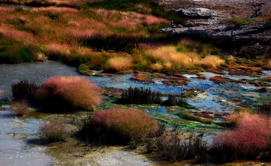 보글보글 뜨거운 물이 흘러나와 지상에서 식어서 작은 연못처럼 고여진곳 에 자라는 풀포기 입니다.