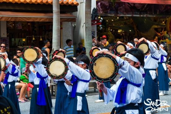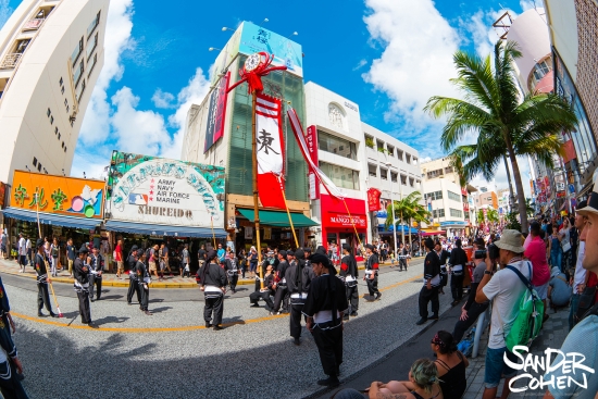 깃발 행렬은 오키나와의 14개 지역에서 참여하며 무게 약 50kg 높이 약 10m의 큰 깃발을 들고 행진합니다.
