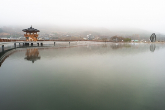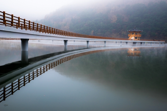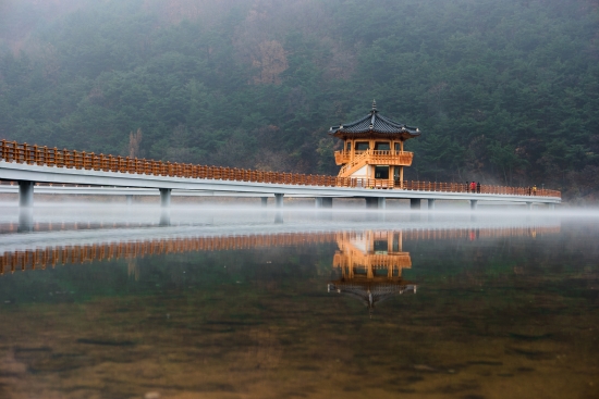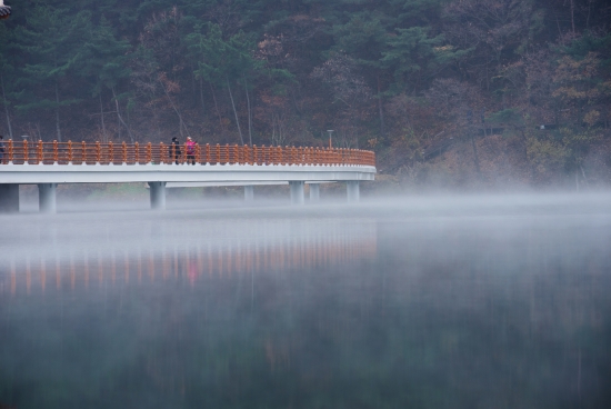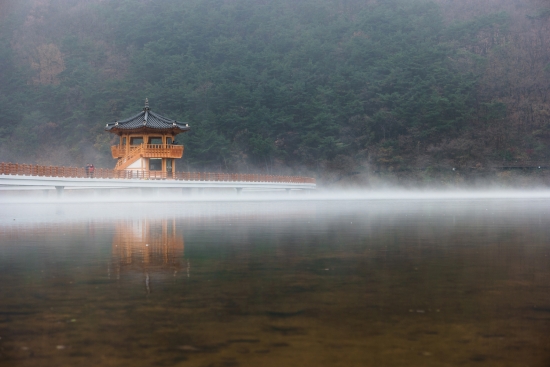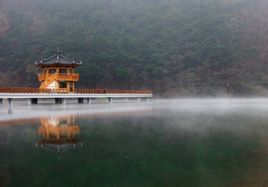 물안개는 피어오르고 반영은 그 아래에 맺친다