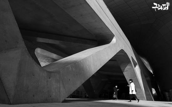 도시의 콘크리트 구조물 사이를 유영하는 사람들,