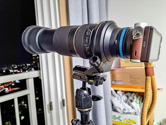 방에 들어와 부랴부랴 삼각대 펼치고 Tamron SP 150-600mm VC 렌즈를 어댑터 물리고 Samsung NX300M 에 마운트 합니다.