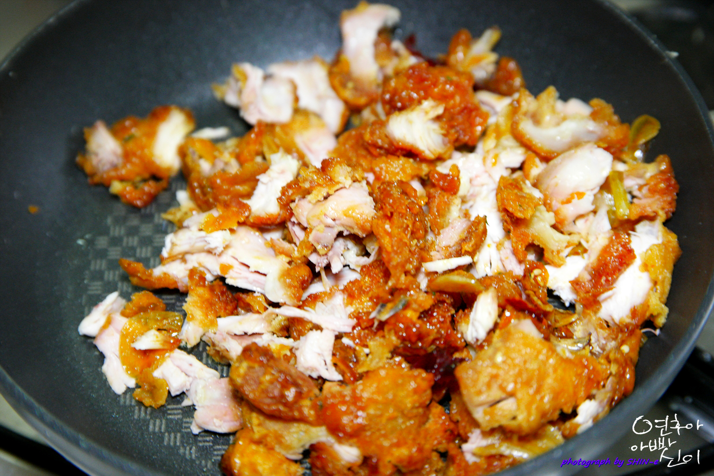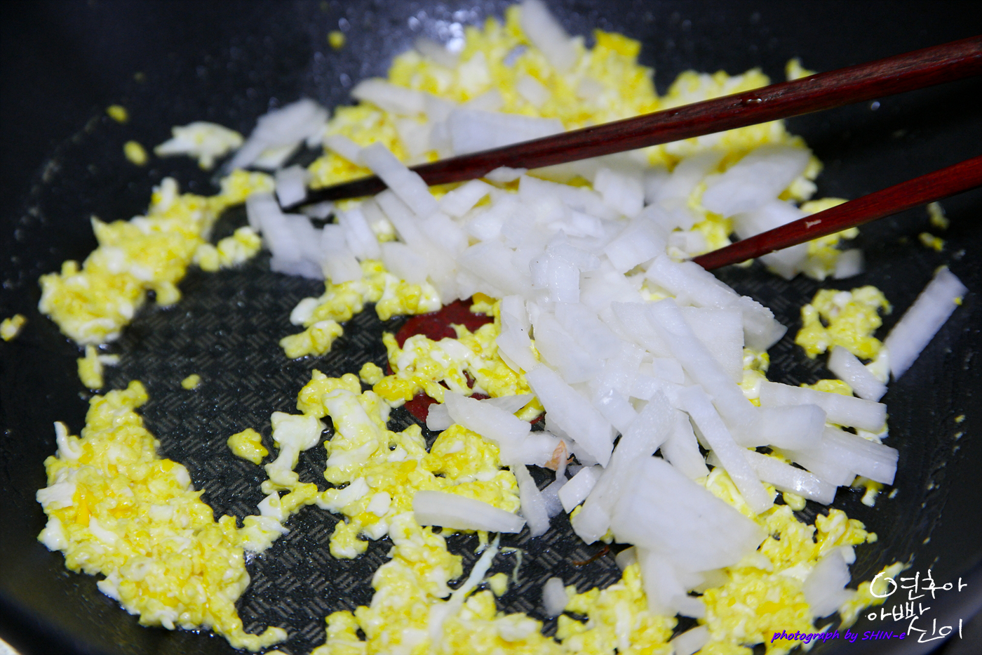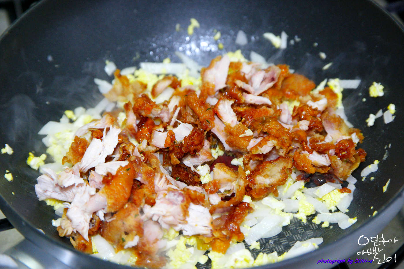 3. 양파를 잘게 썰어 같이 볶다가 치느님을 넣어 주십니다.