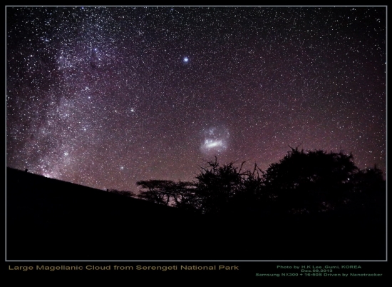 1년반전에 탄자니아에 있는 동물의 왕국 세렝게티초원에 가서 담아본 대마젤란 은하입니다. 아프리카 적도부근의 강렬한 한낮의 풍경과 완전 무공해 밤하늘이 아직 그립습니다. 언젠가는 다시한번 가리라.. Photo by H.K Lee ,Gumi, KOREA Dec.09,2013 Samsung NX300 + 16-50S Driven by Nanotracker