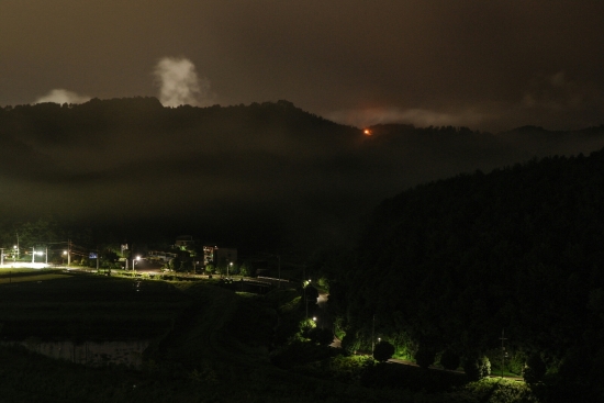우리동네에서는 태풍같지 않은 태풍으로 이번 태풍이 지나갔네요 자기전에 잠깐밖을봤더니 언덕에 밤안개가 피어있어 담아봤습니다 야간촛점잡기 여간 어려운게 아니네요 ㅎ