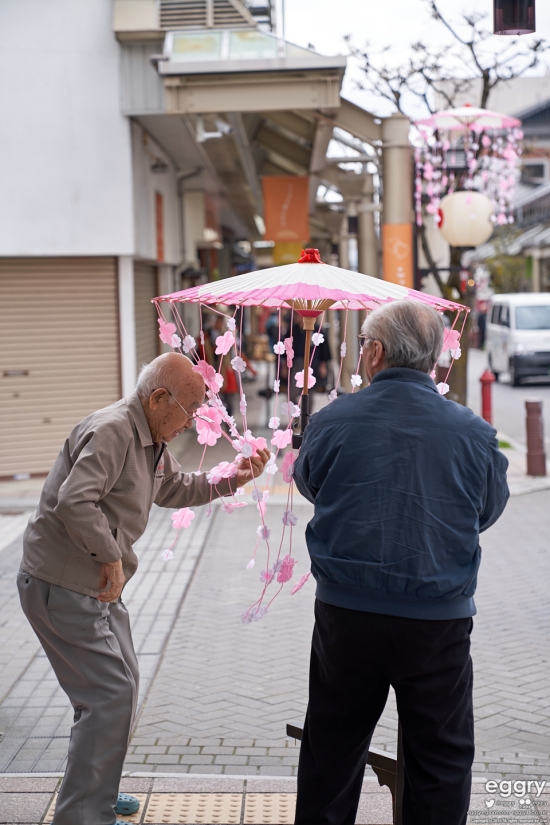 축제날 아침이 되어 구경하러 나가 봅니다. 상점가에선 어르신들이 길거리 등 장식을 달고 계십니다.