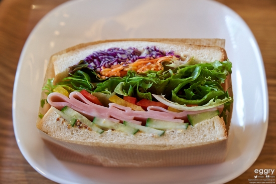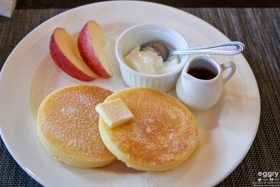 아침은 카페테리아에서 야채 샌드위치와 팬케익