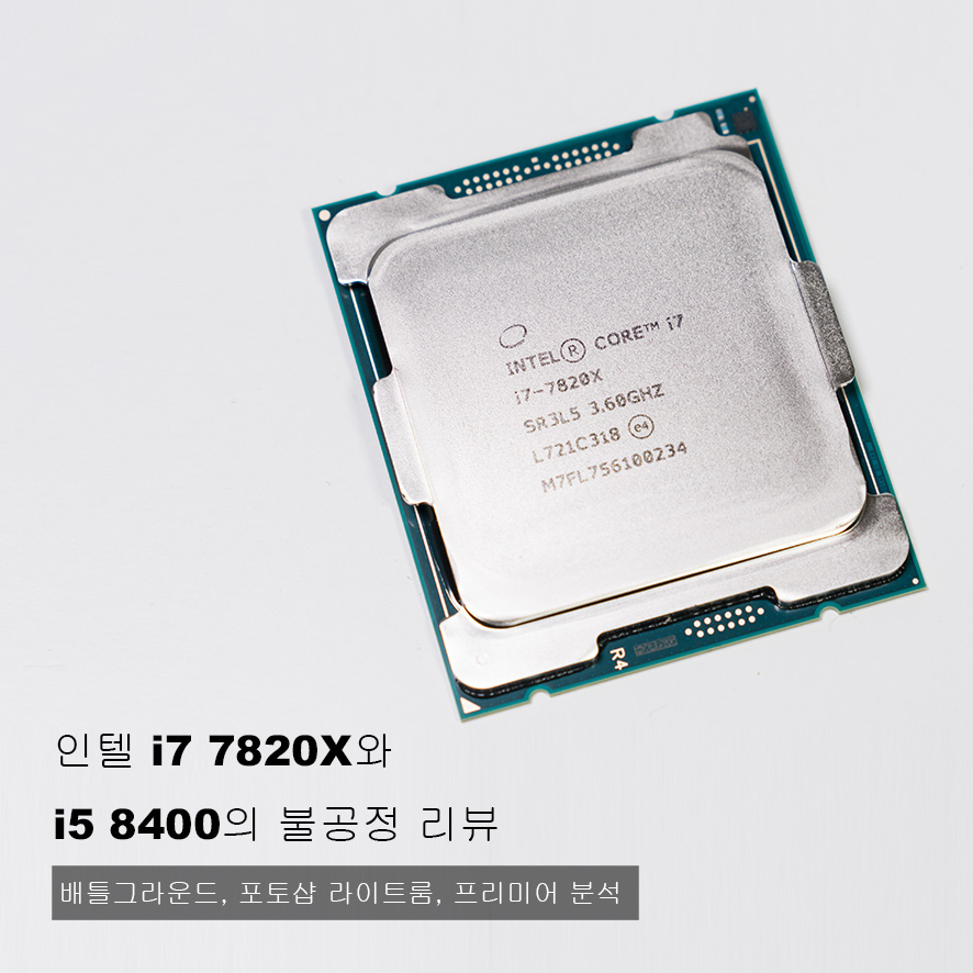 이렇게 불공정한 리뷰를 진행하게 된 배경으로는... 원래 계획은 i7 8700K와 비교할 예정이었으나 테스트 항목에 포토샵과 프리미어가 있는 바람에 전문가용 CPU를 받게 되었습니다. 그래서 본의아니게 이런 리뷰를 진행하게 되었으니 가볍게 봐주세요. i5 8400을 비하하거나 i7 7820X를 과대포장하기 위한 리뷰가 아님을 미리 고지드립니다.