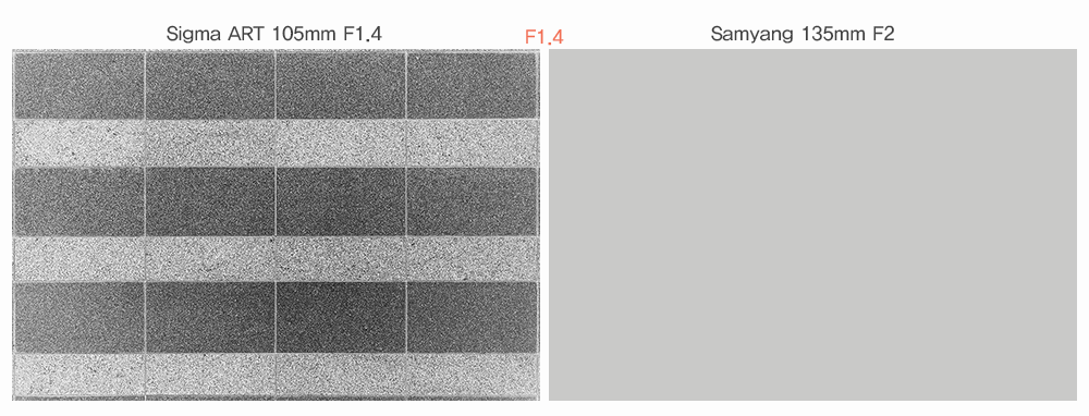 주변부 광량저하입니다. ![]() 개방에서는 주변부 광량저하가 좀 보입니다. F2.0에서도 최주변부에 약간 보이고 F2.8부터는 별 문제없는 수준입니다. 동일 조건에서 최단 촬영 거리에서 밝기가 조금 떨어집니다. 아트 105mm는 해상력보다 보케가 더 관심이 가는 렌즈인데 어떤지 한번 살펴보죠. ![]() 개방 보케를 보면 주변부는 원형이 아니고 럭비공 형태입니다. 이것은 주변부 광량저하가 없지 않다는 반증입니다. F2.0에서는 주변부 광량저하가 없는지 보케가 찌그러지지 않습니다. 보케의 질을 보자면 보케 외각에 거칠게 밝은 부분은 보이지 않고 부드럽습니다. STF 렌즈와 같은 특수 구조 렌즈의 완전한 부드러움은 아니지만 일반 렌즈치곤 상당히 부드러운 보케로 보입니다. 비교할 렌즈가 있으면 좀 더 상세히 파악할 수 있겠지만 현재로서는 이 정도 밖에 알 수가 없습니다. 좋은 해상력 덕분에 주 피사체와 배경과의 분리감도 아주 좋아 보입니다. 하일라이트 보케에 대해서도 파악해 보겠습니다. 먼저 양파 링이 생기는지 보겠습니다. ![]() 특별한 양파링은 생기지 않습니다만 완벽하게 균일하지는 않습니다. 이 정도면 양호한 수준으로 볼 수 있겠네요. 이어서 하일라이트 보케 형태를 보겠습니다. ![]() 개방에서는 주변부 보케가 좀 찌그러집니다. F2.0에서는 거의 원형을 유지하고요. F2.8부터 하일라이트 둘레에 각이 생기기 시작해서 F4.0에서 좀 뚜렷한 각을 볼 수 있습니다. 축상색수차를 점검해 보겠습니다. 거의 최단거리에서 측정한 결과입니다. ![]() 삼양 135mm F2는 축상색수차가 아주 적은 편입니다. 그 기준으로 보면 아트 105 역시 비슷한 수준입니다. 축상색수차가 없는 것은 아니지만 상당히 적은 편이라고 할 수 있습니다. 다만 아주 악조건에서 물론 더 심하게 나타날 수는 있습니다. 색수차도 살펴 보겠습니다. ![]() 위 테스트에서는 색수차 흔적을 찾기 힘듭니다. 다만 극단적 조건에선 나타날 수 있겠지만 일반적으로 색수차는 문제없는 수준이라고 할 수 있겠네요. 극단적인 상황에서는 과연 어느 정도 색수차가 발생하는지 알아보겠습니다. ![]() 조명 주변을 보면 개방과 F2.0에서 색수차가 발생하는 것을 볼 수 있습니다. F2.8에서부터는 거의 사라집니다. 이런 극단적인 경우 외에는 색수차를 보기 힘듭니다. 초점 이동은 어느 정도인지 체크해 봤습니다. 최단 촬영거리에서의 테스트입니다. ![]() 조리개를 조이면 초점이 아주 약간 뒤로 밀립니다. 저 정도는 실제적으로 거의 문제되지 않는 수준으로 보입니다. 강한 빛에 대한 성능도 알아 보겠습니다. ![]() 강한 빛에 대한 성능은 특별히 나쁘거나 특별히 좋은 것도 아닌 것으로 생각됩니다. 참고로 빛갈라짐은 날카롭게 나오지 않고 상당히 둔하게 나옵니다. 광학 테스트 결론 ▶해상력:아주 우수.차트상으로 아주 잘 나오는 렌즈도 실제 촬영시 색수차 등으로 인해 체감 선예도가 기대에 못 미치는 경우가 있는데 반해 아트 105는 실제 촬영에서도 아주 잘 나옵니다. 해상력에선 실망시킬 일이 없는 렌즈라고 봅니다. ▶배율색수차:우수.약간은 있지만 일반적으로 잘 나타나지 않음 ▶축상색수차:아주 우수.없는건 아니지만 상당히 잘 억제된 렌즈라고 할 수 있음. ▶왜곡:거의 없음 ▶보케:아주 좋음.특수 렌즈에는 미치지 못하ㅣ지만 짧은 망원 렌즈로서는 아주 좋은 편임 ▶주변부 광량저하:보통.렌즈 대구경화가 주변부 광량저하를 아주 줄일 수 있을 것으로 기대했으나 기대에는 살짝 못미침 ▶초점 이동;상당히 적음.실제 촬영에서 문제될 수준은 아님 ▶역광 성능:보통 ▶AF:보통. 캐논 5D Mark3에서 테스트 해 본 바 AF 속도는 썩 빠르지는 않습니다. 다만 시끄럽지 않고 정숙한 편입니다. 시그마 MC-11을 통해서 소니 A7Mark II에 물려서 테스트시는 조도가 괜찮고 콘트라스트가 명확한 경우 한번 더듬거리기는 하지만 잘 맞습니다. 그러나 조건이 조금 나빠지면 헤메는 경우가 많습니다. 소니 3세대 카메라에서는 조금 더 나을 것으로 예상합니다. 총평 시그마 아트 105는 시그마의 야심작으로 볼 수 있습니다. 기존 니콘 105mm F1.4가 나와 있는 시점에서 그 보다 훨씬 덩치가 크고 무거운 렌즈를 내놓은 이유는 그만큼 화질에 집중했다는 의미입니다. 실제 촬영에서도 최단 촬영거리 최주변부를 제외하고는 나무라기 힘든 해상력을 보여주며 보케도 전반적으로 105mm로서는 유래없는 흐려짐을 보여줍니다. 그러나 STF 렌즈와 같은 특수 렌즈급의 극도로 부드러운 보케는 아닌데 물리적으로 일반 렌즈 구성으로는 가능하지 않기 때문입니다. 아트 105는 다른 목적보다는 근거리 인물 위주로 사용하는 것이 주목적인 렌즈로 보여집니다. 일반 풍경도 아주 잘 나오긴 하지만 풍경용으로 이런 크고 무거운 렌즈를 주로 사용한다는 것은 닭 잡는데 소잡는 무거운 헤머를 사용하는 것과 마찬가지라고 생각됩니다. 따라서 인물 특화 렌즈로서 이 렌즈를 구입하는 것이 가장 이상적이지 않을까 생각하며 스튜디오용보다는 야외 촬영에 사용하는 것이 보케를 살릴 수 있습니다. 아트 105는 기존 85mm f1.4나 135mm f1.8 또는 135mm f2와 비교시 보케량에서 좀 더 이득이 있긴 하겠지만 그 무