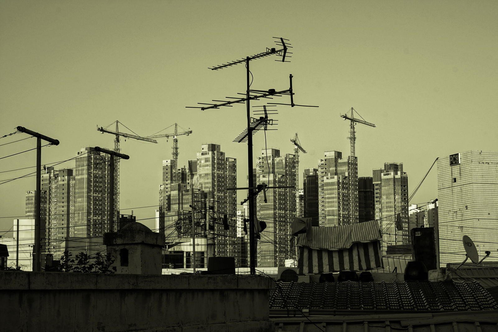 돌아가신 엄마가 살던 집 옥상..... 안테나와 크레인..... 이질감속 어울림...... 이제는 갈 수 없는 집.....